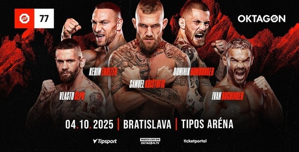 Na turnaji Oktagon 77 sa dnes predstaví celkovo až osem Slovákov, medzi ktorými sú aj veľké hviezdne mená ako Samuel Krištofič, Vlasto Čepo a Ivan Buchinger. S určitoštou sa však tešíme aj na naše talentované bojovníčky Moniku Chochlíkovú a Veroniku Smolkovú. Našu domácu zostavu dopĺňajú skvelí postojári a strikeri Karol Ryšavý, Tomáš Cigánik a Marco Novák.